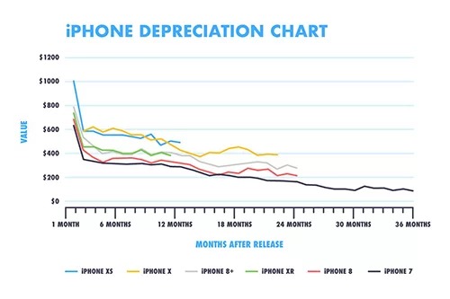 Theo thống kê của về mức độ khấu hao điện thoại của dịch vụ chuyên mua bán đồ điện tử cũ Decluttr (Mỹ), iPhone XR đã mất giá 43%, còn iPhone XS mất giá 49% so với thời điểm ra mắt - 11 tháng trước. iPhone X ra từ 2017 cũng mất giá 59%. Giá trung bình của các sản phẩm này trên thị trường máy cũ tại Mỹ hiện nay lần lượt là 462, 646 và 482 USD.