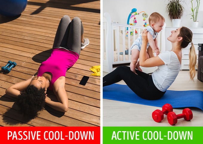 Nằm luôn sau khi tập hoặc ngồi một chỗ xem tivi không phải hoạt động được các chuyên gia thể hình khuyến khích. Khi tập luyện, thân nhiệt của bạn sẽ tăng lên đáng kể. Sau khi tập, bạn cần một khoảng thời gian nhất định để hạ thân nhiệt về mức bình thường. Lý tưởng nhất là thực hiện một số hoạt động nhẹ nhàng làm việc vặt trong nhà hoặc chơi với trẻ em.