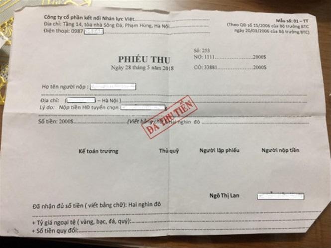 Hóa đơn không có dấu đỏ mà các nhân viên tuyển dụng tự xưng là người thuộc HR Group dùng để thu tiền của người lao động