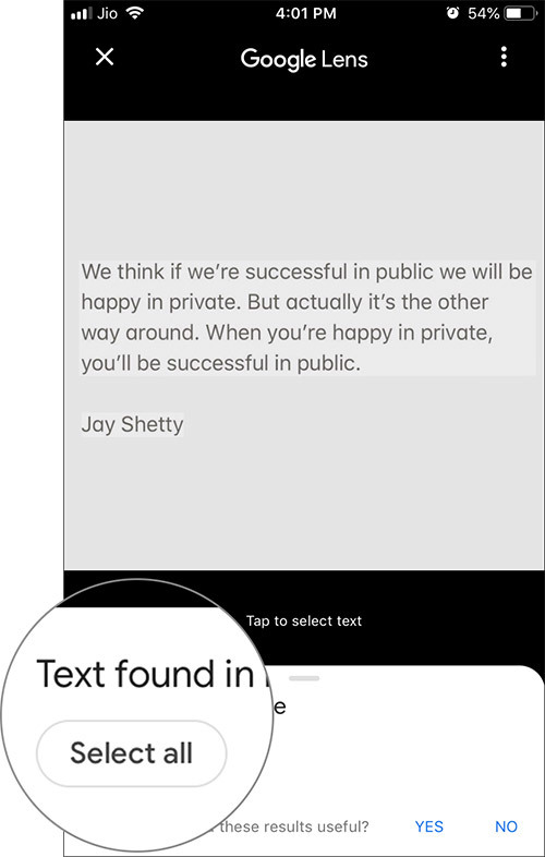 Bước 4: Bấm nút Select All và nó sẽ chọn tất cả văn bản tìm được. Nếu bạn muốn thay đổi lựa chọn, hãy nhấn và giữ lên các tay nắm trên màn hình và di chuyển nó.