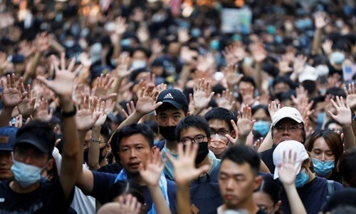 Người biểu t́nh Hong Kong kéo đến lănh sự quán Mỹ hôm 8/9, giơ 5 ngón tay thể hiện 5 yêu sách với chính quyền đặc khu. Ảnh: Reuters.