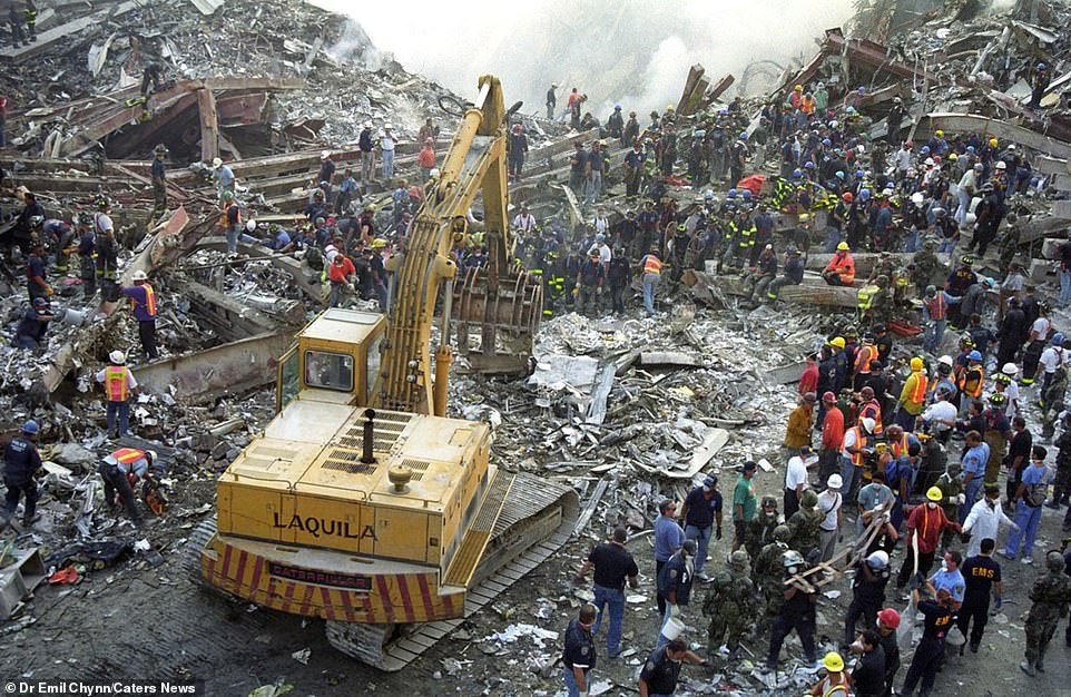 Tình nguyện viên đội mũ cứng và các nhân viên cấp cứu trèo qua các đống đổ nát còn sót lại của Trung tâm Thương mại Thế giới cả ngày lẫn đêm để tìm người sống sót.
