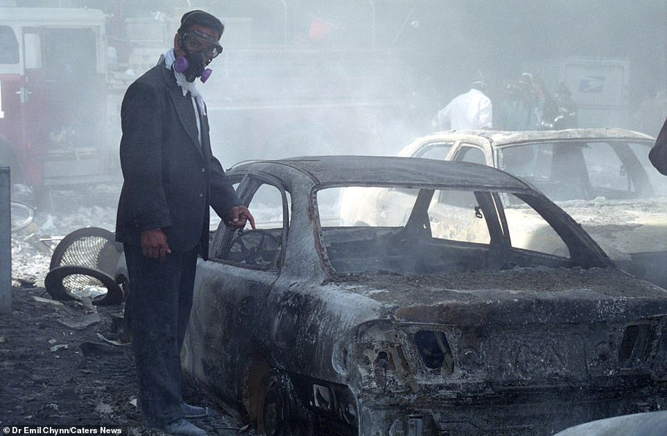 Một người đàn ông mặc áo vest đen và đeo mặt nạ dưỡng khí chỉ vào một chiếc ô tô bị cháy đen ở Ground Zero. Không chỉ cướp đi gần 3.000 sinh mạng, các vụ tấn công khủng bố đã gây thiệt hại ít nhất về tài sản và cơ sở hạ tầng theo thống kê lên tới 10 tỷ USD.