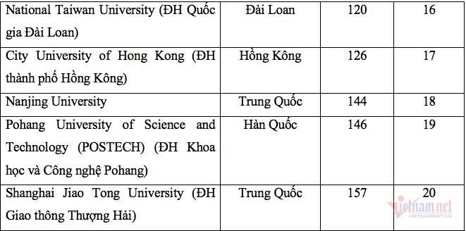 Tốp 20 các trường châu Á trong bảng xếp hạng.