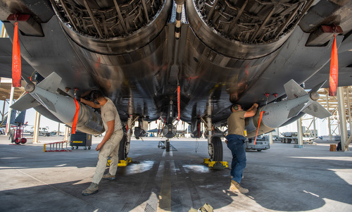 Kỹ thuật viên gắn bom GBU-31/B cho tiêm kích F-15E trước cuộc không kích. Ảnh: USAF.