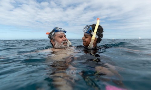 Murrumu Walubara cùng con trai chèo thuyền trong vùng nước trong vắt của Rạn san hô Great Barrier, ẩn nấp phía dưới là những con cá kèn, hải sâm và ṣ tai tượng.