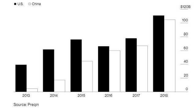 Các giao dịch vốn đầu tư mạo hiểm của Trung Quốc tăng vọt trong 5 năm qua, gần bằng với Mỹ. Nguồn: Preqin
