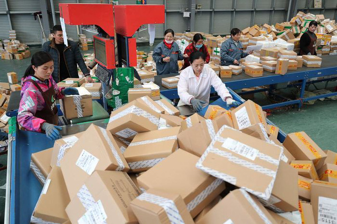 Công nhân tại một trung tâm xử lư hàng hóa của Alibaba tại Trung Quốc.