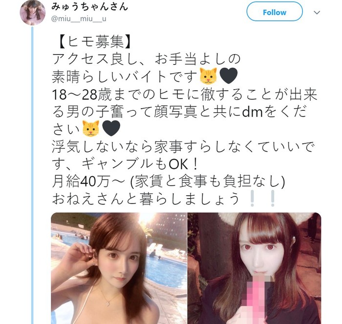 Nguyên văn bài đăng của cô gái xinh đẹp như sau: “Đây là một công việc bán thời gian tuyệt vời, chỉ cần là đàn ông trong độ tuổi từ 18 - 28, nếu không muốn làm việc hãy gửi hồ sơ cho tôi. Yêu cầu đơn giản không ngoại tình, kể cả không thích làm việc nhà hay đánh bạc cũng không sao, mỗi tháng tôi có thể chu cấp 400.000 yên, tiền ăn ở cũng không cần lo, chúng ta sống cùng nhau”.
