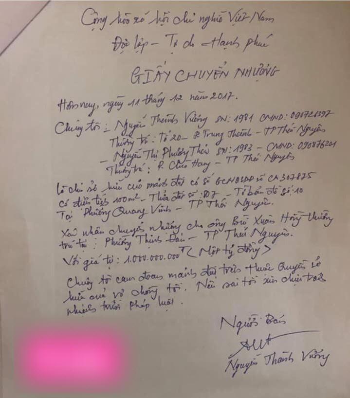 Cụ thể hơn, ngày 11.12.2017, Thảo - Vương đã viết giấy chuyển nhượng mảnh đất 100m2 ở phường Quang Vinh, TP Thái Nguyên cho ông Hồng với giá 1 tỉ đồng (lúc đó bìa đỏ đang ở trong ngân hàng) để trả nợ khoản vay 3 tỉ đồng. Vương ký tên vào giấy này. Đây là mảnh đất mà Thảo – Vương vay ngân hàng 850 triệu đồng để mua lại. Song sau đó, cả hai lại âm thầm bán cho người khác với lý do... trả nợ ngân hàng. Ngày 23.11.2018, Thảo - Vương viết giấy xác nhận với ông Hồng rằng bán đất 1 tỉ cho người khác.