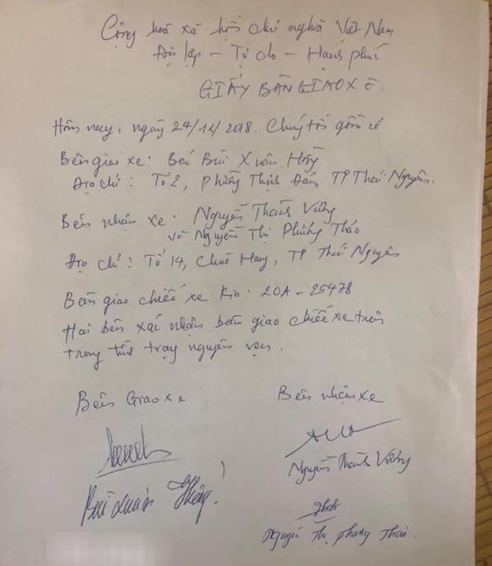 Chưa hết, Thảo - Vương còn mua một chiếc ô tô trả góp và đến ngày 24.11.2018 đã viết giấy bàn giao xe cho ông Hồng như trừ vào khoản vay 3 tỉ đồng. Dẫu vậy, ô tô vẫn đứng tên Thảo – Vương. Tiền vay ngân hàng mua ô tô, hai vợ chồng này trả hằng tháng. Mấy tháng sau, Thảo - Vương mượn ô tô chạy nhưng không trả lại cho ông Hồng. Lúc ông Hồng sang nhà lấy chìa khoá ô tô mang về thì họ kiện với công an và vu khống chú ăn trộm?! Người thân cho biết ông Hồng phải lên trụ sở công an viết bản tường trình và giao lại ô tô cho đôi vợ chồng gian manh. Song, thông tin này đang được kiểm chứng.