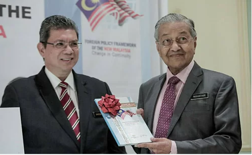 Thủ tướng Malaysia Mahathir (phải) và Ngoại trưởng Datuk Saifuddin Abdullah trong buổi ra mắt "Khung Chính sách đối ngoại của Malaysia mới". Ảnh: Bernama.