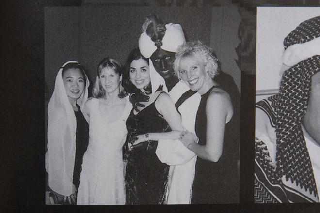 Ông Trudeau (thứ hai từ phải qua) trang điểm da mặt và tay màu nâu trong bữa tiệc năm 2001. Ảnh: Time.