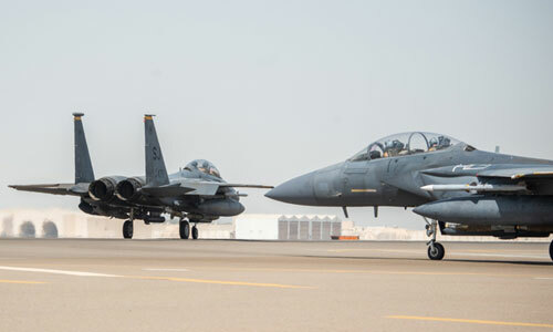 Không quân Mỹ ngày 18/9 công bố những bức ảnh cho thấy hai tiêm kích F-15E xuất hiện tại căn cứ không quân Al Dhafra của Các Tiểu vương quốc Arab Thống nhất (UAE). Sau khi được các kỹ thuật viên lắp đầy đủ cơ số tên lửa, bom, hai tiêm kích cất cánh tới căn cứ Prince Sultan của Arab Saudi.