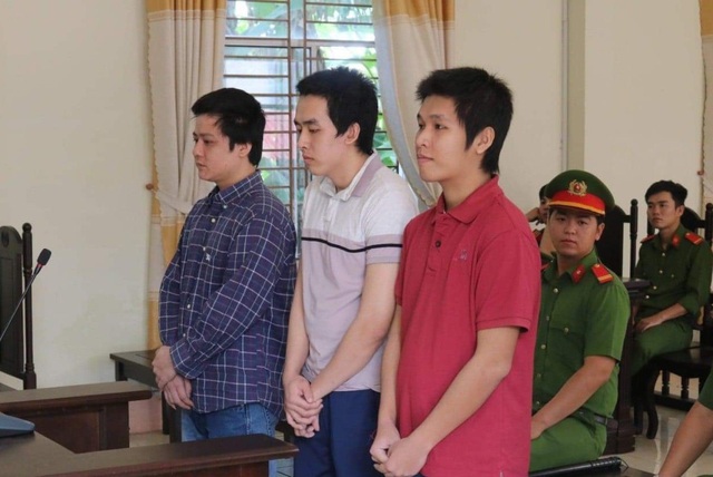 Bị cáo Cường (áo đỏ) cùng 2 bị cáo Khương và Huy trước vành móng ngựa