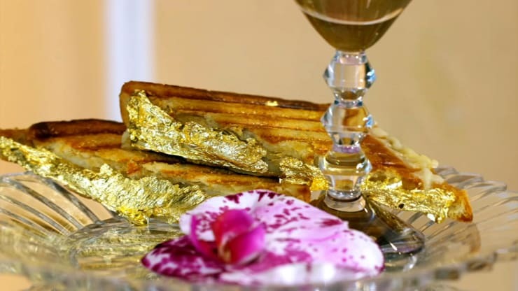 Phô mai được làm tan chảy trong một máy ép panini cho tới khi bắt đầu sủi bọt. Một lần nữa, chiếc bánh cùng lớp phô mai được đưa vào lò nướng để giúp phô mai chảy đều. Phần trang trí cuối cùng thuộc về những lát vàng 23K mỏng đến độ ăn được, bọc quanh miếng sandwich để hoàn thiện vẻ đẹp hoàng gia của nó.