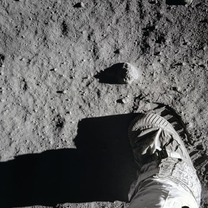 Hình ảnh bàn chân của Buzz Aldrin trên mặt trăng. Có vẻ như dấu chân vẫn còn nguyên vẹn, vì mặt trăng không có bầu khí quyển hay mưa làm mờ nó