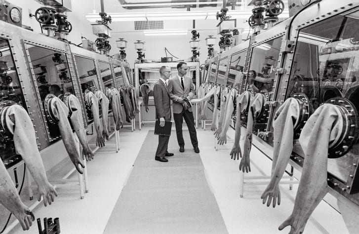 Phi công chỉ huy tàu Apollo 11 Michael Collins kiểm tra Phòng thí nghiệm tiếp nhận mặt trăng của NASA tại Trung tâm tàu vũ trụ có người lái ở Houston