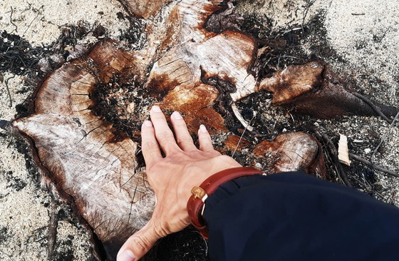 Theo nhận định hiện trường, từng cây lâu năm bị cưa hạ bằng máy cưa xăng, cây lớn được vận chuyển đi tiêu thụ, trục lợi. Hiện trường được thu dọn, đốt thành nhiều đợt hòng xóa dấu vết. Những cội cây dương cổ thụ sẽ bị nhổ gốc, cho đến khi không còn dấu tích nào của rừng trên cát nữa. Ảnh: NGỌC OAI