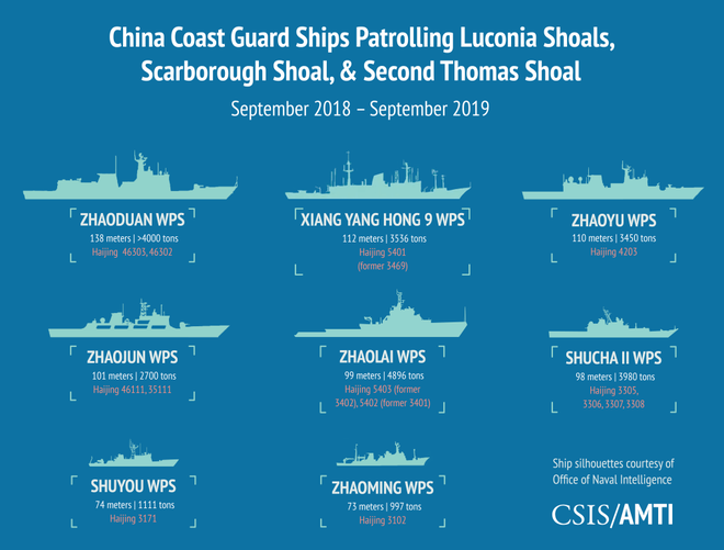 Một số tàu hải cảnh Trung Quốc được AMTI xác định thường xuyên hoạt động quanh bãi Luconia, bãi Scarborough và bãi Cỏ Mây trong giai đoạn tháng 9/2018-tháng 9/2019 (Ảnh: AMTI)