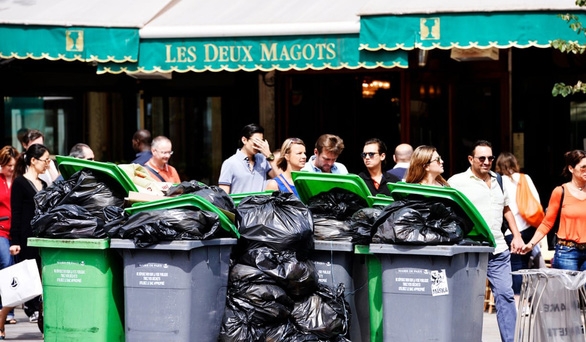 Những thùng rác đầy ắp và bốc mùi trước "Les Deux Magots", một trong những quán cà phê nổi tiếng tại Paris - Ảnh: AFP
