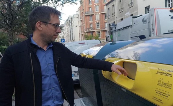 Ảnh chụp hôm thứ hai 23-9, tại quận 13, Paris. Ngài phó thị trưởng Paul Simodon phụ trách vệ sinh đô thị giới thiệu mẫu thùng rác thế hệ mới đang được lắp đặt và vận hành thử nghiệm tại thủ đô - Ảnh: FACEBOOK