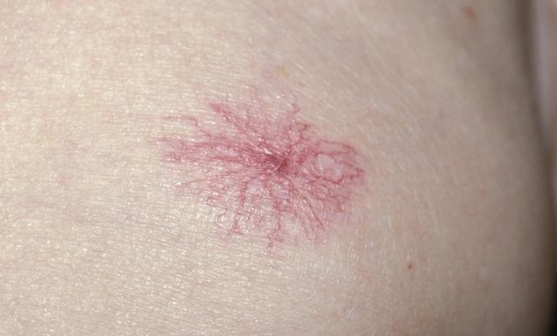 Cho dù đó là bệnh gan mạn tính hay xơ gan, thì nốt “mạng nhện” là một trong những dấu hiệu dễ dàng gặp phải. Nốt “mạng nhện” thực chất là u mạch nổi lên trên bề mặt da. Sự thay đổi này gây ra một chấm đỏ trên bề mặt da, từ nhánh mạch nhỏ lan tỏa ra xung quanh các đường vành nhìn giống như mạng nhện.