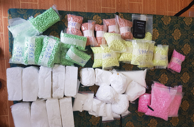 Khám xét chỗ ở các nghi phạm trên, cảnh sát thu giữ 15 kg ketamine và 50.000 viên thuốc lắc.