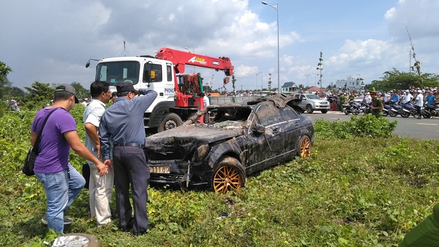 Chiếc ô tô Mercedes bị lao xuống rạch, hai thanh niên và một phụ nữ đang mang thai 7 tháng mắc kẹt trong xe. Khi xe được trục vớt lên thì cả ba người đã tử vong.