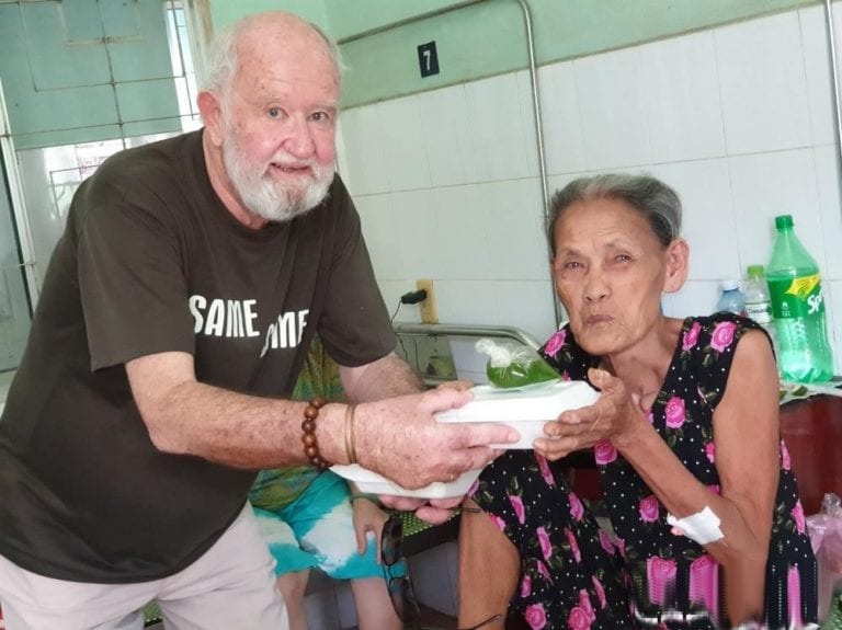 Ông Ken Marsden ân cần trao suất cơm cho một bệnh nhân già yếu.