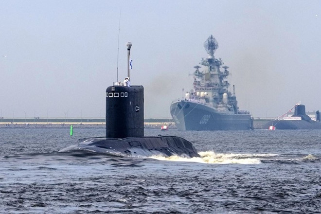 Tàu ngầm Kolpino của hải quân Nga, chạy bằng điện-diesel, xuất hiện trong buổi diễn binh mừng ngày truyền thống lực lượng tại quân cảng Kronstadt. Ảnh: Sputnik
