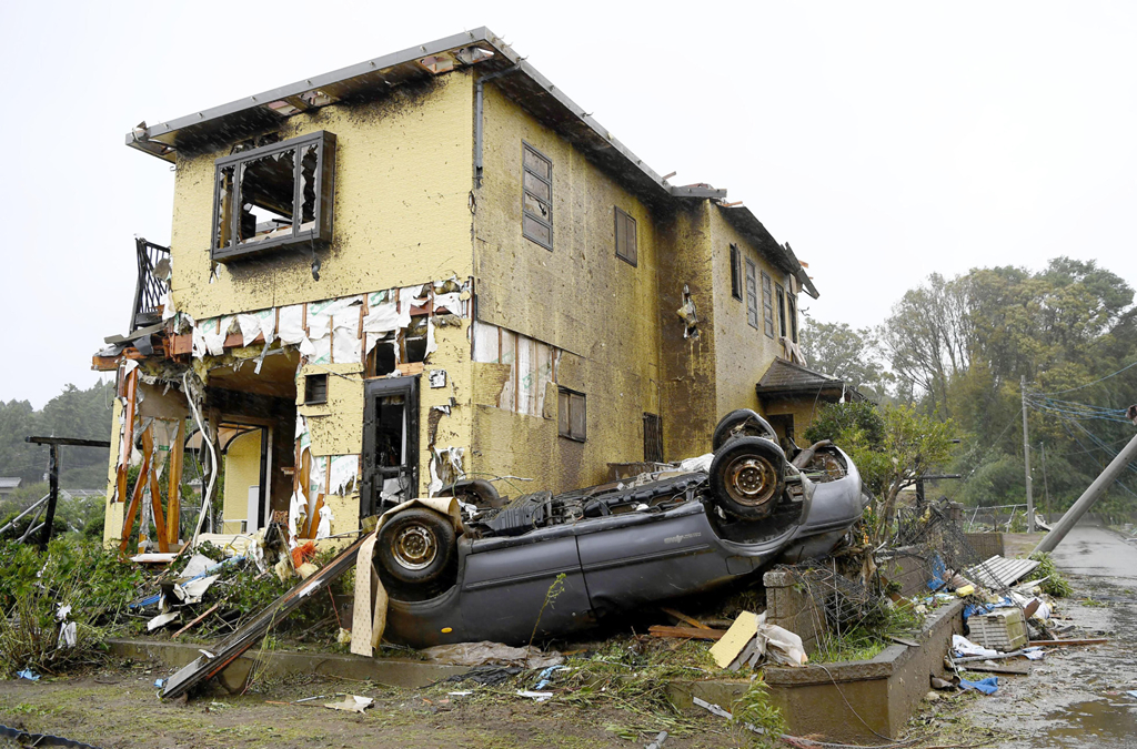 Ngôi nhà và chiếc xe được cho là bị hư hại do lốc xoáy ở Ichihara, tỉnh Chiba vào sáng 12/10, theo giờ địa phương. Ảnh: Kyodo.