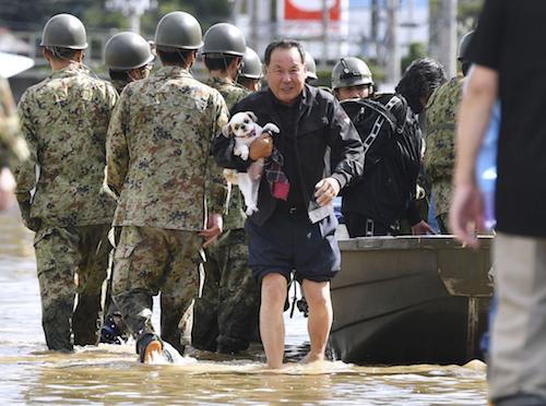 Bộ Quốc phòng Nhật đã huy động 27.000 thành viên Lực lượng Phòng vệ nước này đến các vùng bị ảnh hưởng bởi lũ lụt và sạt lở.