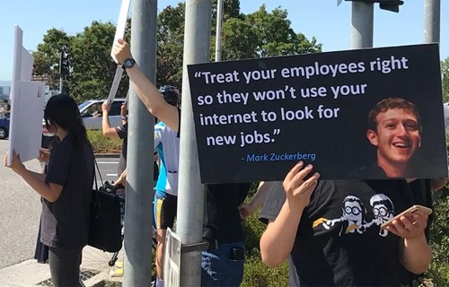 Một lời yêu cầu từ người biểu t́nh trước trụ sở Facebook: "Hăy đối xử công bằng với người lao động để họ không phải sử dụng Internet của bạn để t́m việc mới". Ảnh: Standford-daily.