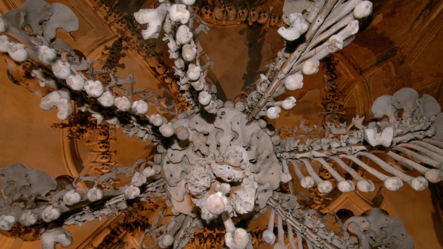 Những sáng tạo làm từ xương người đáng chú ý nhất là chiếc đèn chùm ở giữa phòng và huy hiệu của Schwarzenbergs. Những bộ xương này được đưa đến đây một cách tự nguyện từ thi thể của những người Công giáo La Mã sùng đạo trên khắp châu Âu, những người ao ước được chôn cất thi thể tại đây sau khi qua đời. Nhưng vì có quá nhiều người muốn được chôn cất trong khi đất của nhà nguyện chỉ có giới hạn. Vì thế những bộ xương còn lại đã được sử dụng làm thành nội thất của nhà nguyện.