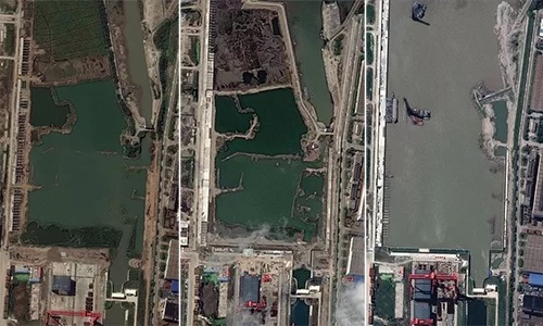 Ảnh vệ tinh nhà máy đóng tàu Giang Nam, ngoại ô Thượng Hải, Trung Quốc vào tháng 10/2018 (trái), tháng 4/2019 (giữa) và tháng 9/2019 (phải). Ảnh: CSIS.