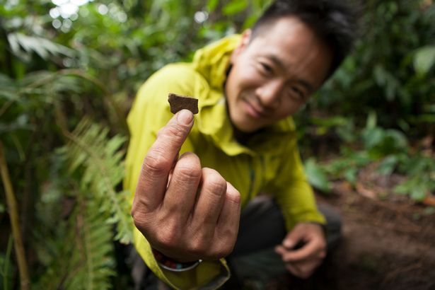 Albert Lin cầm trên tay mảnh gốm, dấu hiệu cho thấy nơi đây từng có cộng đồng ngưới sinh sống.