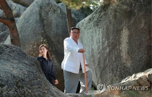 Bà Ri Sol-ju đi sau chồng bà, Chủ tịch Kim Jong-un, trong chuyến đi đến Núi Kumgang trong bức ảnh do KCNA công bố hôm nay. Ảnh: Yonhap.