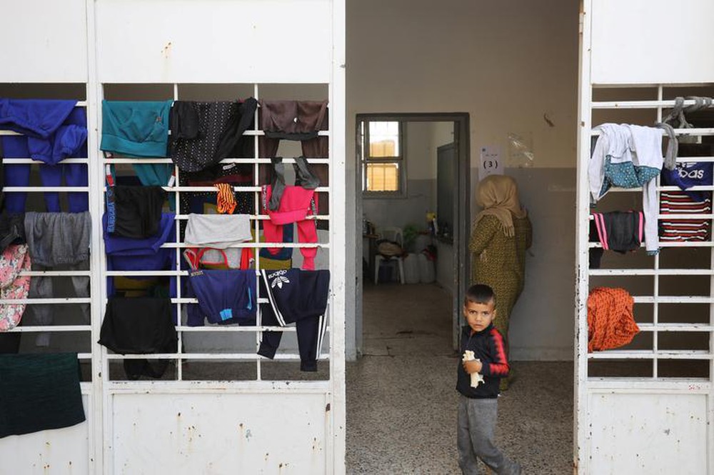 Các gia đình người Kurd và Ảrập lánh nạn trong một ngôi trường công ở Hasakah.