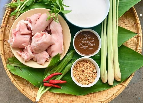 - Bước 5: Cho chân giò ra đĩa, thêm ngò gai, rau om thái nhỏ và đậu phộng giã nhuyễn lên mặt. Khi ăn chấm cùng tương xay.