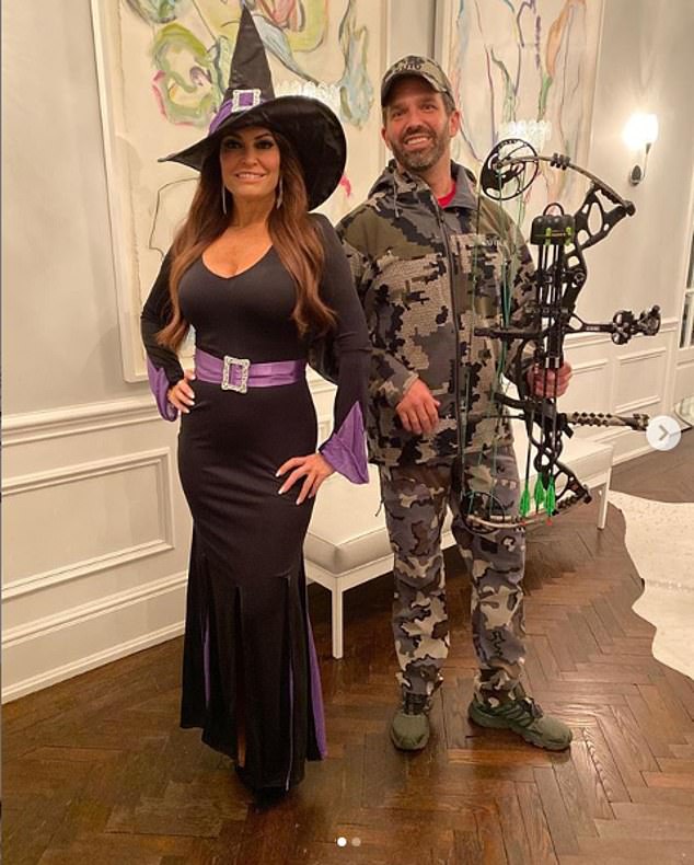 Theo Daily Mail, trong bức ảnh đăng tải trên Instagram, bạn gái Kimberly Guilfoyle hóa trang thành “phù thủy”, con Donald Trump Jr mặc trang phục ngụy trang kiểu quân sự, tay cầm vật giống như cung tên.