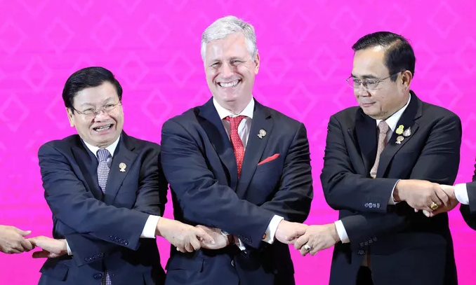 Cố vấn An ninh quốc gia Mỹ Robert O’Brien (giữa) tại Hội nghị Cấp cao ASEAN - Mỹ ở thủ đô Bangkok - Thái Lan hôm 4-11 Ảnh: Reuters