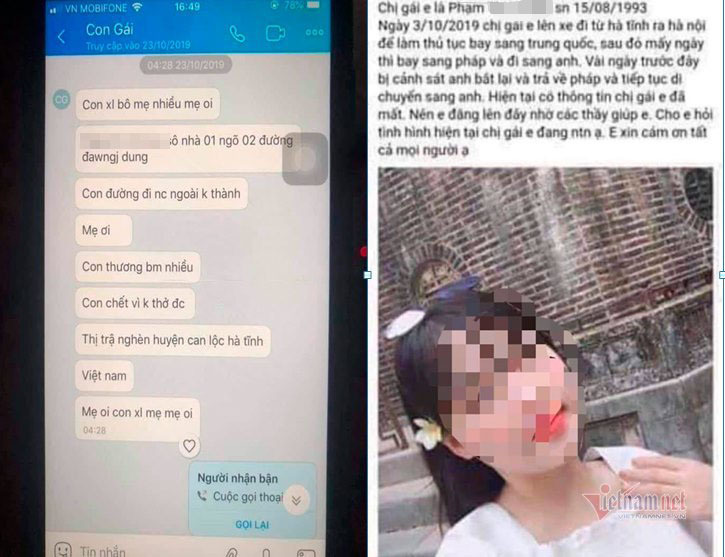 Em Tr.M., một trong những người ở Can Lộc được cho là mất tích khi qua Anh