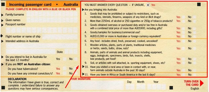 Và để việc khai báo nhập cảnh thuận tiện hơn, hiện thẻ hành khách đến đã được dịch và in ra bằng nhiều thứ tiếng, trong đó có tiếng Việt. Trước đây du khách Việt Nam thường điền vào mẫu tiếng Anh. Tờ khai có 11 câu hỏi, trong đó từ câu 6 đến 9 liên quan đến thực phẩm và nông nghiệp. Nếu hành khách còn nghi ngờ rằng liệu hàng hóa mình mang theo có nằm trong danh mục này không thì được khuyên nên đánh dấu "có" ("yes"). Sau đó, khi được kiểm tra, bạn hãy chỉ cho nhân viên an ninh sinh học những gì đã khai báo.