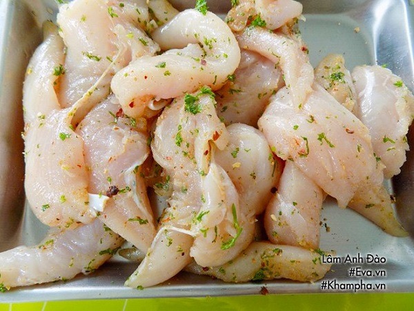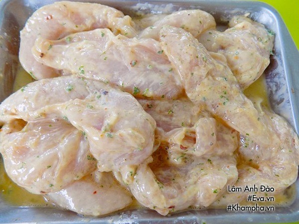 - Bước 1: Thịt ức gà rửa sạch, thấm khô rồi thái miếng to, dài. Cho thịt vào âu cùng muỗng muối tiêu ớt trộn đều.