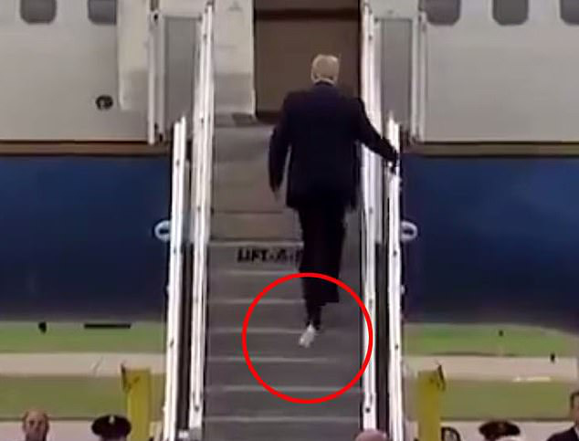 Khi bước lên máy bay, Tổng thống Mỹ Donald Trump gây chú ý không phải vì đang nói chuyện thân mật với phu nhân Melania mà đế giày ông bị dính giấy vệ sinh.