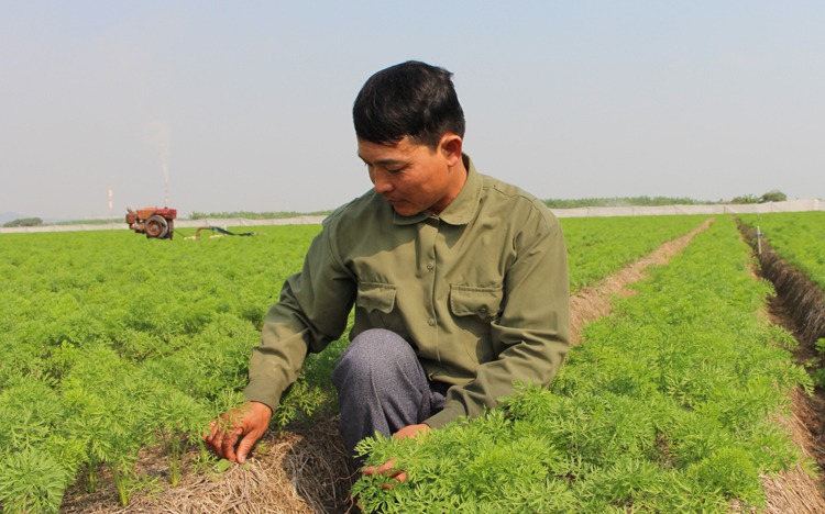 Anh Linh kiểm tra tốc độ phát triển của cà rốt vụ thu đông này. Ảnh: Phạm Nga.