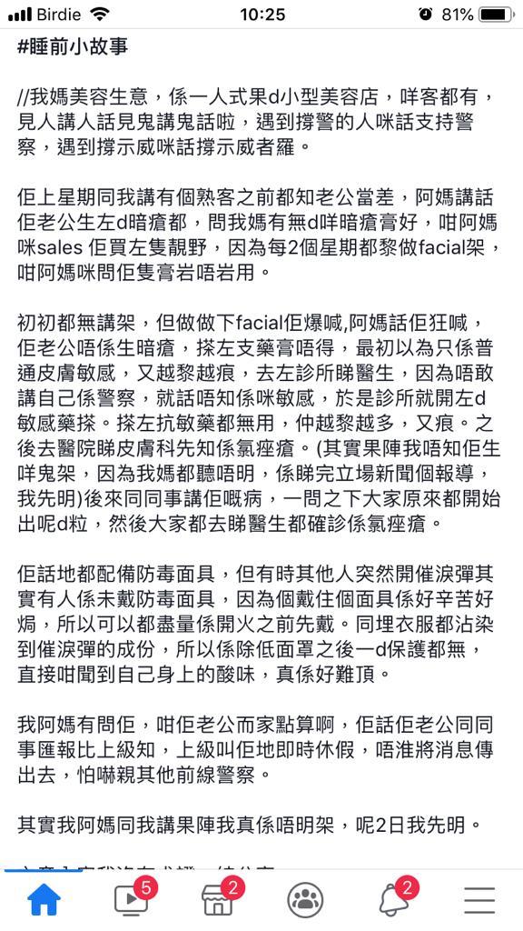 Số lượng lớn bom hơi cay mà cảnh sát Hồng Kông tung ra cũng làm hại chính họ. Gần đây cộng đồng mạng Hồng Kông đã chia sẻ thông tin nhiều cảnh sát cũng đang bị bệnh lở loét do clo.