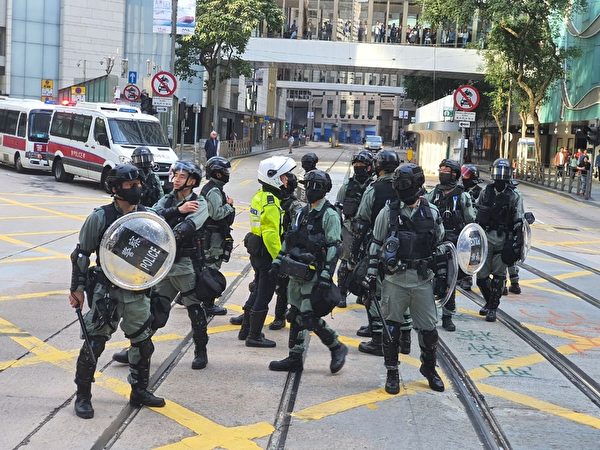 Cảnh sát canh chừng người dân trong hoạt động “Bữa trưa cùng bạn” tại khu thương mại Central Hồng Kông ngày 15/11 (Hình: Epoch Times).