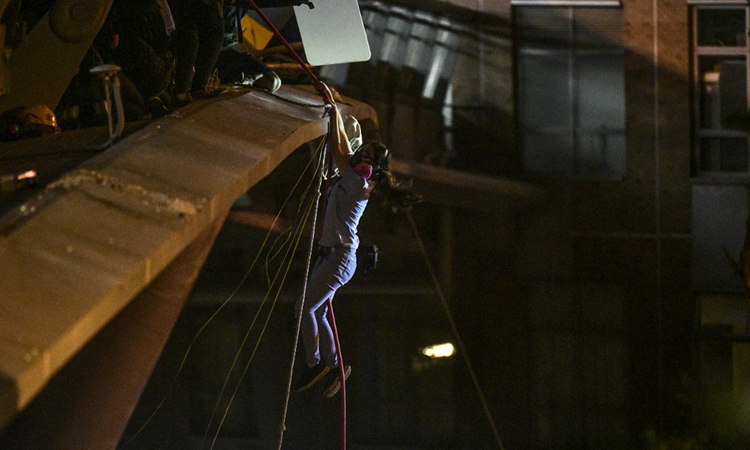Người biểu tình Hong Kong đu dây thoát khỏi trường. Biểu tình vẫn chưa có dấu hiệu hạ nhiệt ở đây. Cảnh sát phong toả trường Đại học Bách Khoa Hong Kong.